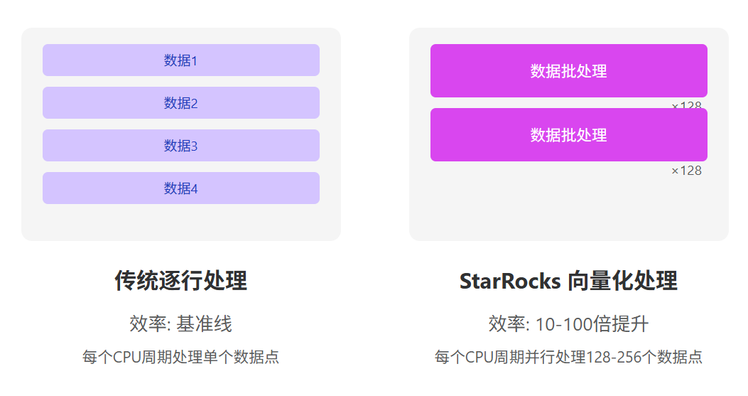 StarRocks 的核心优势在于其向量化执行引擎,它利用现代 CPU 的单指令多数据(SIMD)能力,同时处理多个数据点。传统引擎按行处理数据,而 StarRocks 按批次向量化处理,每个 CPU 指令周期可同时处理 128 或 256 个数据值,大幅提升计算效率。