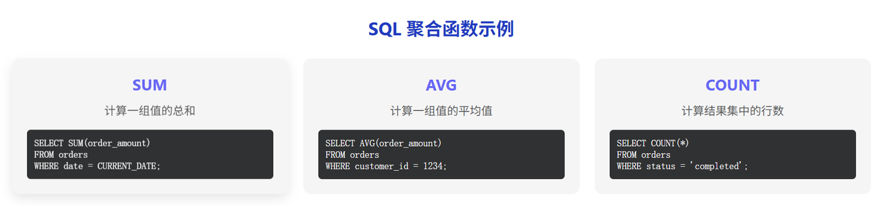 在数据库领域,数据聚合通常通过 SQL 中的聚合函数实现,如 如 SUM(求和)、AVG(平均值)、COUNT(计数) 等。这些操作将多行数据转换为单行摘要信息,提供对整体数据特征的洞察。例如,电商平台需要了解每日销售总额、平均订单金额或总订单数等关键指标。