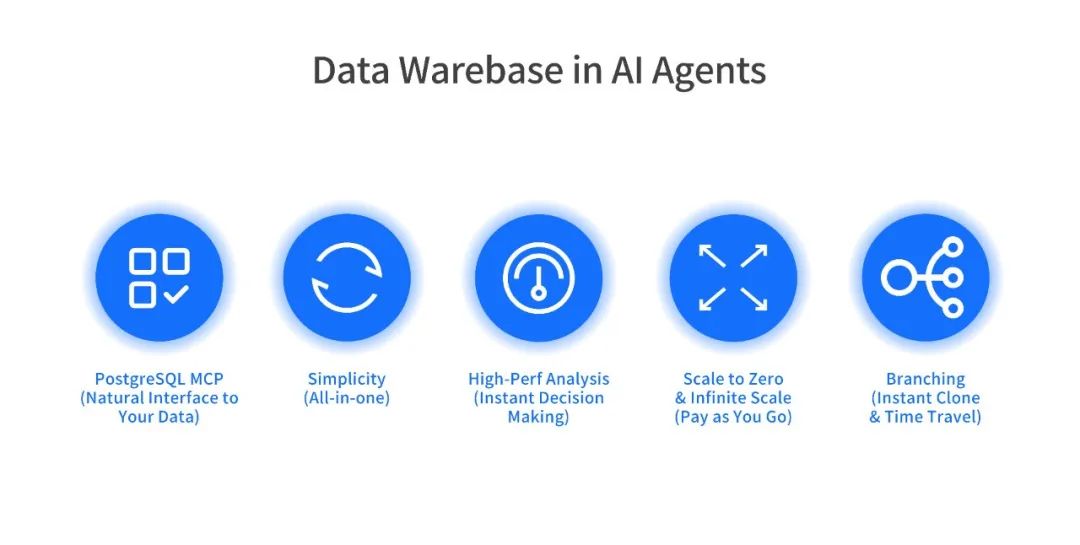 AI Agent 战场率先掀起革命。未来大部分服务将依托 AI Agent 进行智能交互,而 AI Agent 需要一个强大的 Data API,Data Warebase 提供了强大的多模查询、极致弹性、以及分支管理的能力,能够很好地支持 AI Agent 的场景。未来的 AI Agent,不需要对接多个 MCP,而是连接一个多模数据库。用一个数据库,一个 MCP 接口,极大降低 LLM 大模型的智力和推理的门槛。