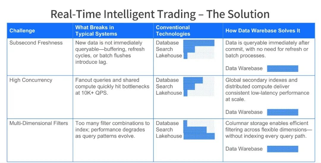 当 Data Warebase 打破数据架构领域持续数十年的 “不可能三角”,商业世界的价值裂变已然在真实战场爆发——从金融领域的量化交易和实时风控,到车机数据每秒更新并即时进行规则匹配和安全分析...... 技术范式跃迁正沿着三重坐标轴撕开万亿市场的豁口: