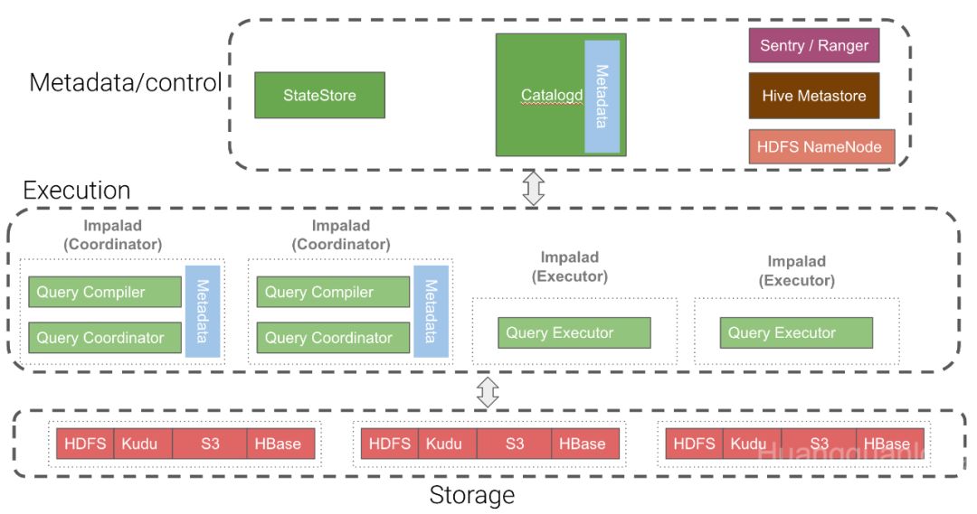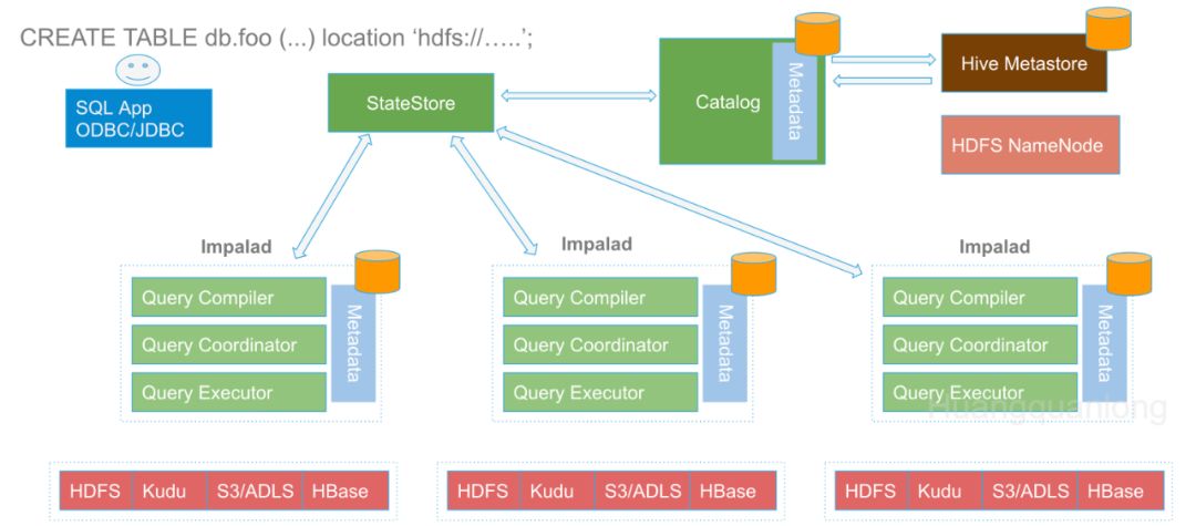 Impala集群包含一个 Catalog Server (Catalogd)、一个 Statestore Server (Statestored) 和若干个 Impala Daemon (Impalad)。Catalogd 主要负责元数据的获取和DDL的执行,Statestored主要负责消息/元数据的广播,Impalad主要负责查询的接收和执行。