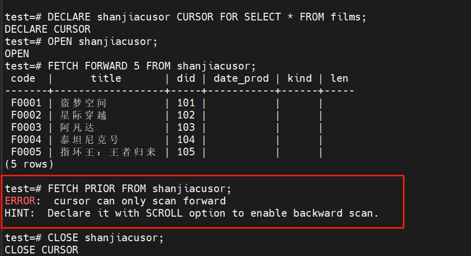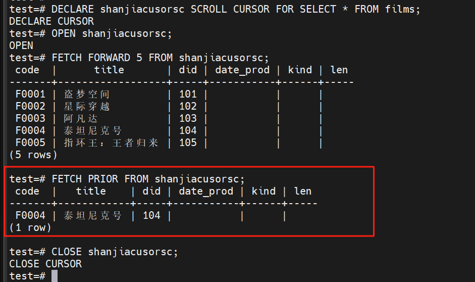 -- 声明一个可滚动的游标DECLARE shanjiacusorsc SCROLL CURSOR FOR SELECT * FROM films;-- 打开游标OPEN shanjiacusorsc;-- 从游标中取出前 5 行FETCH FORWARD 5 FROM shanjiacusorsc;-- 使用 FETCH PRIOR 语句FETCH PRIOR FROM shanjiacusorsc;-- 关闭游标CLOSE shanjiacusorsc;