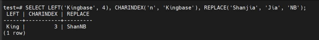 ##字符串函数SELECT LEFT('Kingbase', 4), CHARINDEX('n', 'Kingbase'), REPLACE('Shanjia', 'Jia', 'NB');