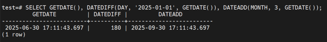 ##日期函数SELECT GETDATE(), DATEDIFF(DAY, '2025-01-01', GETDATE()), DATEADD(MONTH, 3, GETDATE());