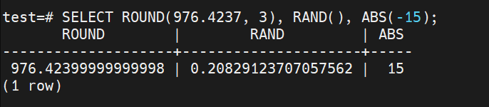 ##数学函数SELECT ROUND(976.4237, 3), RAND(), ABS(-15);