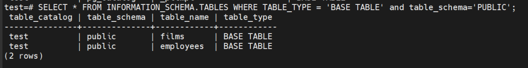 ##查看系统信息表SELECT * FROM INFORMATION_SCHEMA.TABLES WHERE TABLE_TYPE = 'BASE TABLE' and table_schema='PUBLIC';