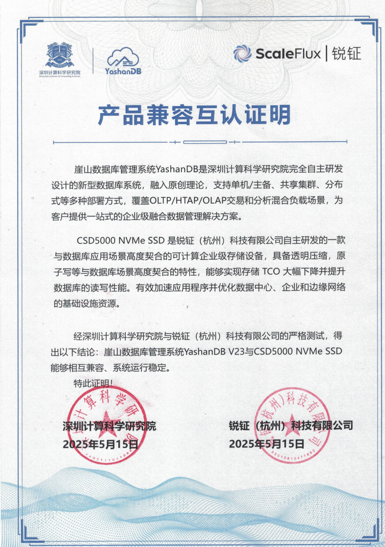 CSD5000 NVMe SSD 是锐钲(杭州)科技有限公司(简称“锐钲科技”)自主研发的一款与数据库应用场景高度契合的可计算企业级存储设备,结合CSD5000 NVMe SSD的透明压缩、原子写、可用容量拓展等特性,能够实现存储 TCO 大幅下降并提升数据库的读写性能。全面提升业务决策效率与系统稳定性。配合YashanDB卓越的并发处理、弹性扩展及混合负载能力,为企业级复杂数据调度与分析场景提供一站式高性能解决方案,助力金融、政务、能源等关键行业加速数智化升级。