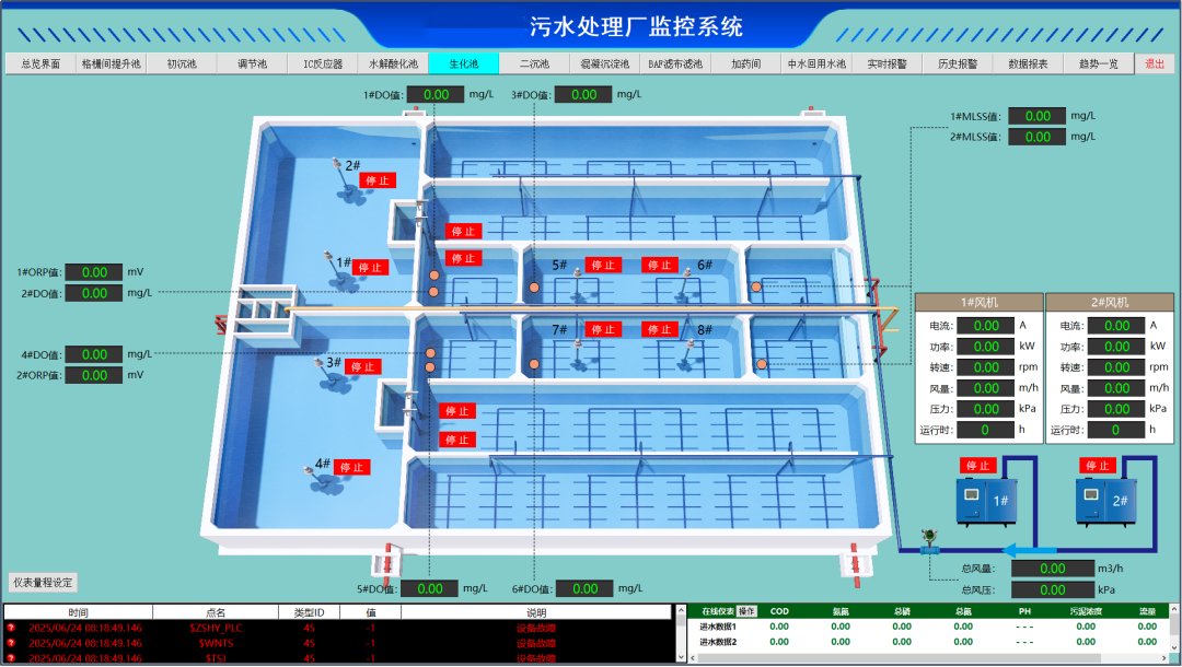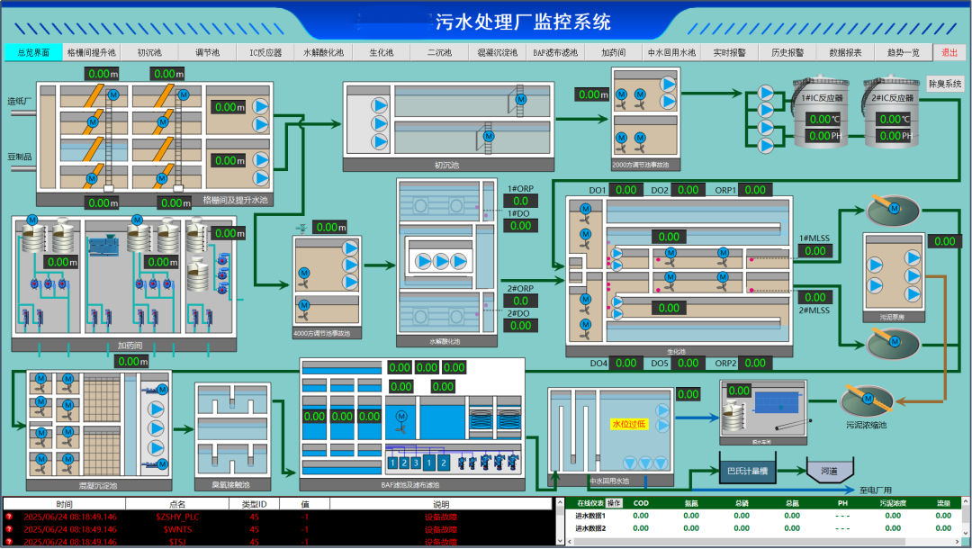 工艺流程:以图形化的方式展示污水厂的工艺流程,包括各个处理单元的连接关系、设备布置等。操作人员可通过工艺流程画面直观地了解整个污水处理过程的运行状态。