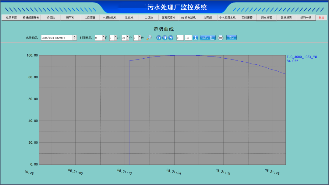 实时数据:在工艺流程画面上实时显示各个工艺参数的数值和状态,如进水流量、出水水质指标、设备运行状态等。同时,可通过趋势图、柱状图等方式展示数据的变化趋势,帮助操作人员分析生产过程的运行情况。