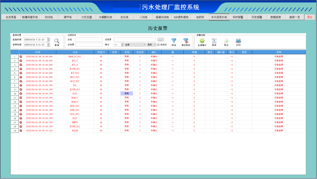 参数设置:操作人员可根据实际需求设置各个工艺参数的报警阈值,如水质指标的上限和下限、设备运行参数的异常范围等。