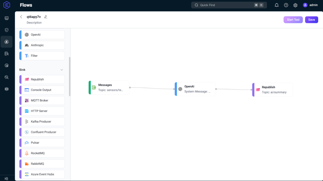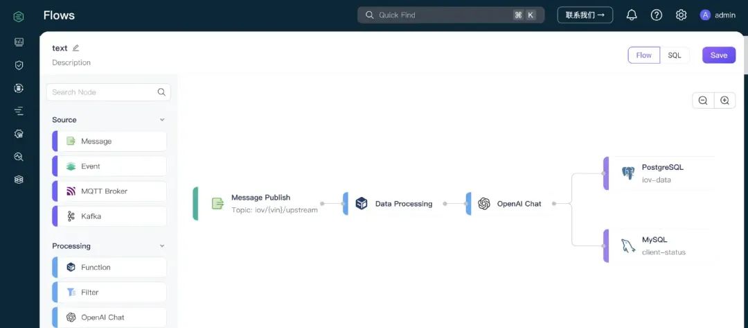 这一愿景正在成为现实。随着 EMQX 5.10.0 的发布,实时数据流与人工智能的融合已进入全新阶段,我们创新性地在可视化流处理引擎中集成大语言模型(LLM)。这将为您的 MQTT 数据流注入 OpenAI GPT、Anthropic Claude 以及任何兼容 OpenAI 的大模型的强大功能。