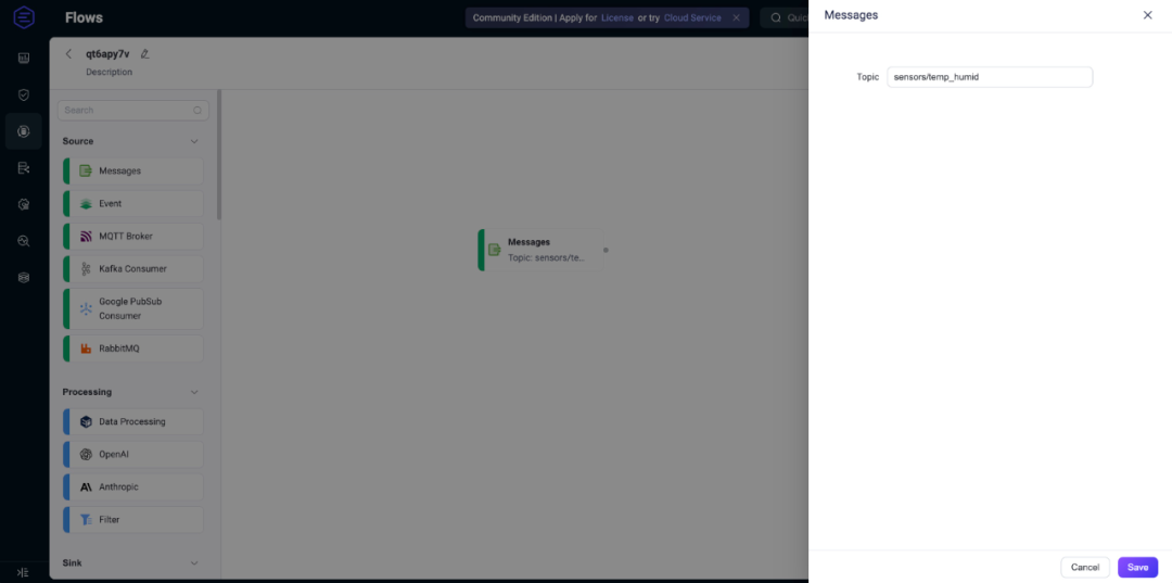 在 EMQX Flow 设计器中,将「消息节点」拖到画布上。配置它以订阅您设备发布数据的 MQTT 主题,例如 sensors/temp_humid