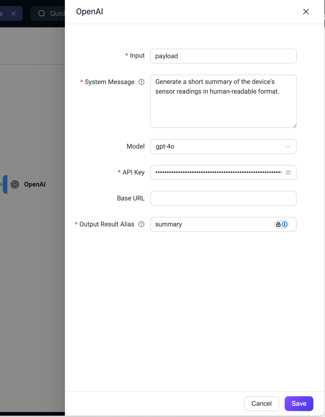 无需编写代码,通过可视化 Flow 设计器即可快速构建一个读取传感器数据,并使用 OpenAI 生成易读摘要的数据流。