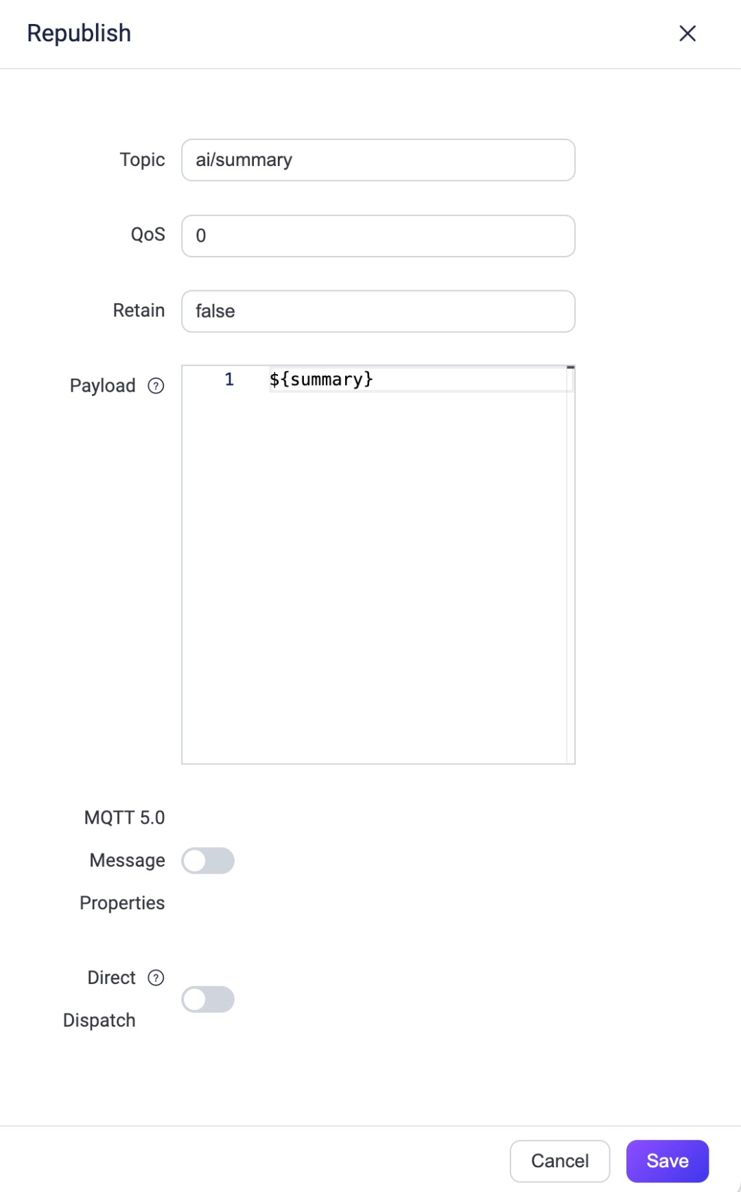 从输出面板拖出一个「重新发布」节点并将其连接到 OpenAI 节点。配置它并将结果发布到一个新主题中,如「ai/summary」