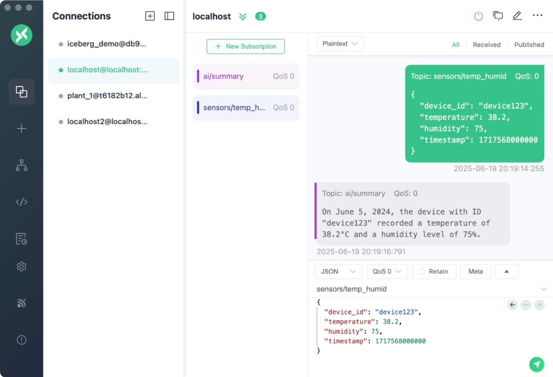 EMQX 创新性地解决了这一痛点。通过将 AI 处理能力直接嵌入数据流,您可以构建智能工作流,实时分析、增强和转换 MQTT 消息。这为开发具备实时感知、推理和响应能力的新型应用奠定了基础。