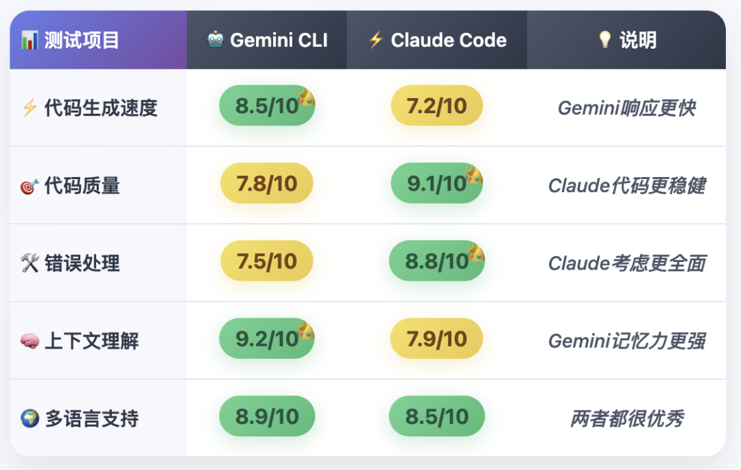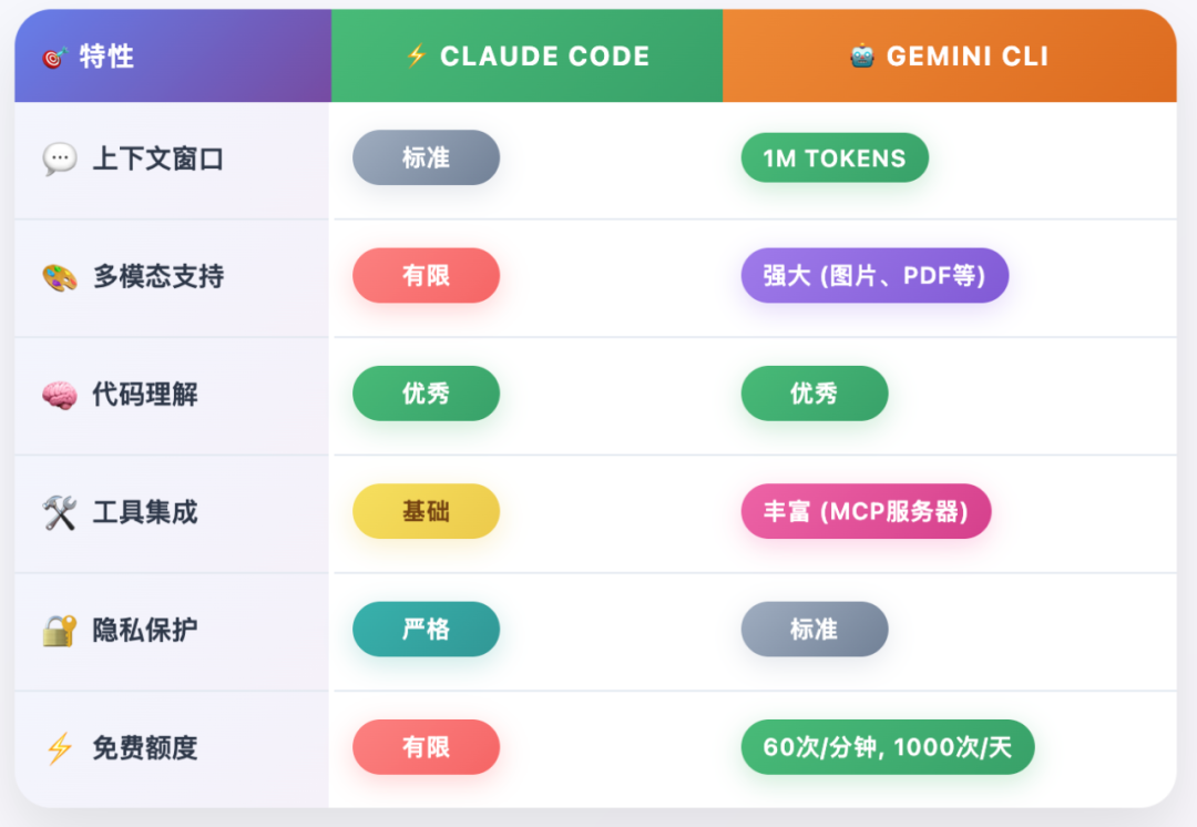 整体来说,如果你更看重性价比和想要快速试错,那就选Gemini CLI,它特别适合处理大项目和喜欢尝试新东西的开发者。但如果你对代码质量要求很高,做的是重要的商业项目,需要稳定可靠的企业级服务,那Claude Code会是更好的选择。