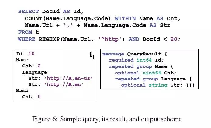 Dremel的查询语言基于SQL,其实现是定制化设计的,可在列状嵌套存储上高效执行。定义语言严格上不是本文范畴,这里简介一下它的特点。每个SQL语句(被翻译成代数运算)以一个或多个嵌套表格和它们的schema作为输入,输出一个嵌套表格和它的schema。图6描述了一个query例子,执行了投影、选择和记录内聚合等操作(投影-projection,选择-selection,是SQL中的概念,可参考这里,就是SQL select语句中的各个部分)。例子中的query执行在图2中的t = {r1,r2}表格上。字段是通过路径表达式来引用。查询最终根据某种规则产出一个嵌套结构的数据,不需要用户在SQL中指明构造规则。