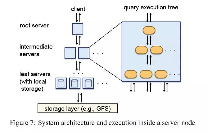 【译者预读】分布式、并行计算是毋庸置疑的,此章节就是描述在数据分布式存储之后,如何尽可能并行的执行计算过程。核心概念就是实现一个树状的执行过程,将服务器分配为树中的逻辑节点,每个层级的节点履行不同的职责,最终完成整个查询。整个过程可以理解成一个任务分解和调度的过程。Query会被分解成多个子任务,子任务调度到某个节点上执行,该节点可以执行任务返回结果到上层的父节点,也可以继续拆解更小的任务调度到下层的子节点。此方案在论文中称为服务树(serving-tree)
