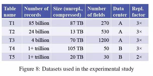 在这个章节里我们利用几个在Google使用的数据集合对Dremel的性能进行评估,以检验嵌套数据的列状存储到底效率如何。图8中描述了实验使用的数据集合的基本信息。数据集合如果不压缩、不复制,大概占据一个PB的空间。所有table是三向复制的,除了一个双向复制的table,tablets大小不一,从100K到800K。我们开始是在单台机器上检验基础数据访问特征,然后展现列状存储如何优于MR执行过程,最后重点分析一下Dremel的性能。实验运行在两个数据中心的系统节点上,和其他常规应用一起运行。除非另有说明,执行耗时一般会由5次结果求平均。下面使用匿名的Table和字段名。