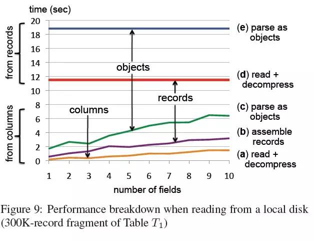 图中有5个曲线,说明了读取、解压数据、装配、解析记录的耗时。曲线(a)-(c)描述了列状存储的结果。这些图中每个数据点都平均通过了30次测量,每一次都随机选择一定数量的列。曲线(a)展现了读取和解压缩耗时。曲线(b)添加了装配嵌套记录的耗时。曲线(c)展现了将记录解析为强类型的c++数据结构的耗时。