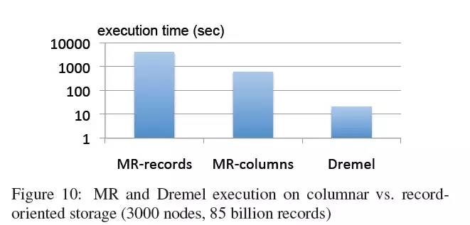 图10展现了两个MR任务和Dremel的执行耗时。两个MR任务被运行在3000个工作节点上。相似的,执行查询Q1的Dremel实例也拥有3000个节点。Dremel和MR+列状存储,读取大约0.5TB的压缩列状数据,MR+面向记录存储读取87TB数据。如图所示,MR从面向记录切换到列状存储后性能提升了一个量级(从小时到分钟)。使用Dremel则又提升了一个量级(从分钟到秒)。