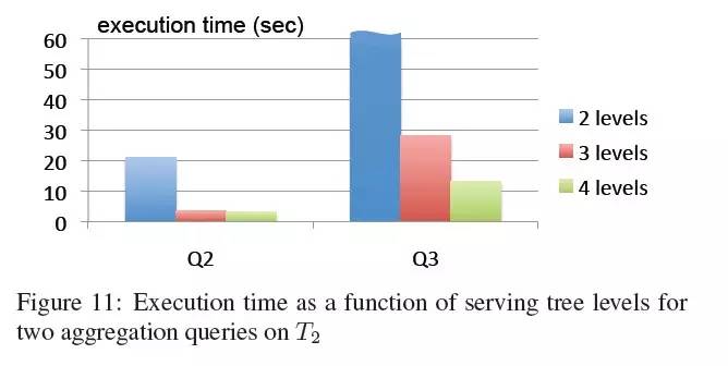 使用3级拓扑时,查询Q2可以在3秒内完成,增加到4级拓扑时收益就不大了。Q3则不同,从3级到4级耗时减少了一半,因为对于Q3来说4级拓扑可以有效增强它的并行能力。在2级拓扑中,Q3的耗时都超过了图的上限,因为根节点服务器几乎需要顺序的聚合从几千个叶子节点收到的结果(不能并行)。实验证明了当聚合(group by)返回的group越多时(domain有1.1 million条而country只有几百条)多层级服务树的收益就越明显。