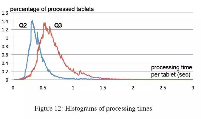 tablet视角的曲线图。为了更深的探寻在查询执行过程中发生了什么,我们统计出了图12。此图展示了叶子节点的服务器执行Q2和Q3时处理tablet的速度。当一个tablet被调度到可用slot上执行时开始计时,也就是说耗时不包括等待任务队列的时间,并且消除了其他并发执行的查询造成的影响。以百分比为值的曲线覆盖的总面积就是100%。如图所示,Q2中99%的tablets在1秒内处理完成,Q3中99%的tablet在2秒内完成。