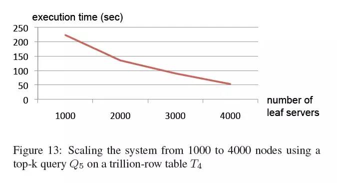 我们使用4种配置的系统来执行此查询,节点数量范围从1000扩展到4000。图13显示了执行耗时。在每次运行中,总计CPU消耗时间近似相同,大约300K秒,但用户感知的耗时随着系统节点数量增长而几乎线性的减少。这个结果表明Dremel系统规模增大时并不会降低资源利用率(一般分布式系统规模扩展的越大就会消耗更多的资源在业务处理之外的开销上),而执行过程可以更快。