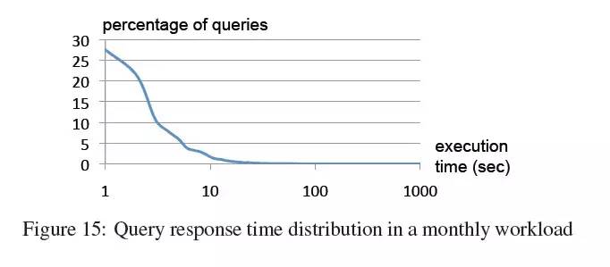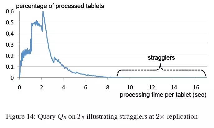 查询Q6运行在1TB的压缩数据上。待查询字段的压缩比大约是10。如图14所示,每个slot对每个tablet的处理耗时中,99%是低于5秒的。然而,一小部分的tablet花费了非常长的时间,减慢了查询响应时间(从少于一分钟到好几分钟),系统节点规模为2500个。下一章节将对我们的实验结果和教训进行总结。