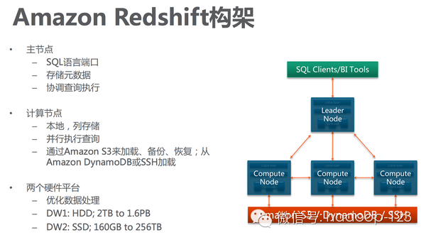 Amazon RedShift是 ParAccel一个版本。它是一种(massively parallel computer)架构,是非常方便的数据仓库解决方案,SQL接口,跟各个云服务无缝连接,最大特点就是快,在TB到PB级别非常好的性能,我在工作中也是直接使用,它还支持不同的硬件平台,如果想速度更快,可以使用SSD。