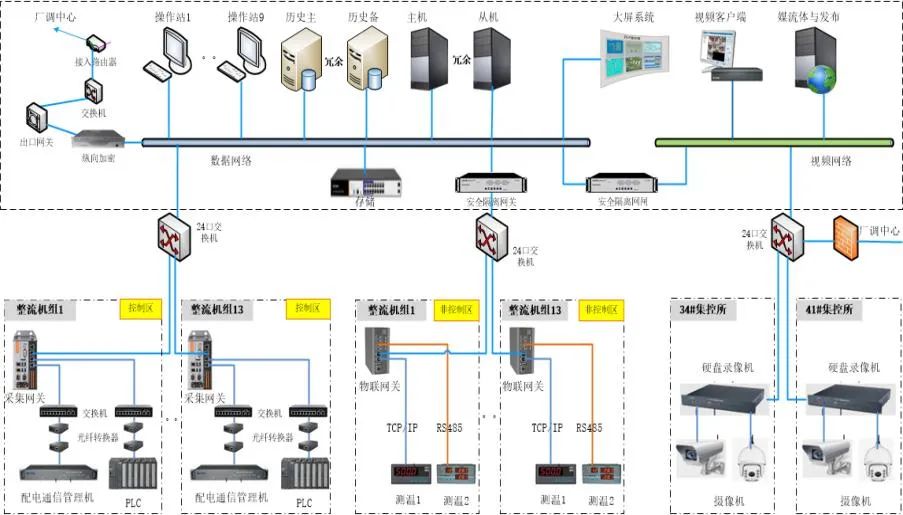 系统通过工业采集网关整合配电所继保装置、整流PLC系统及温度监测数据,实现对直流电流/电压、水温/水压、变压器油温/档位等多源参数的统一采集与传输,并依托光纤网络将数据实时汇总至厂调控中心。