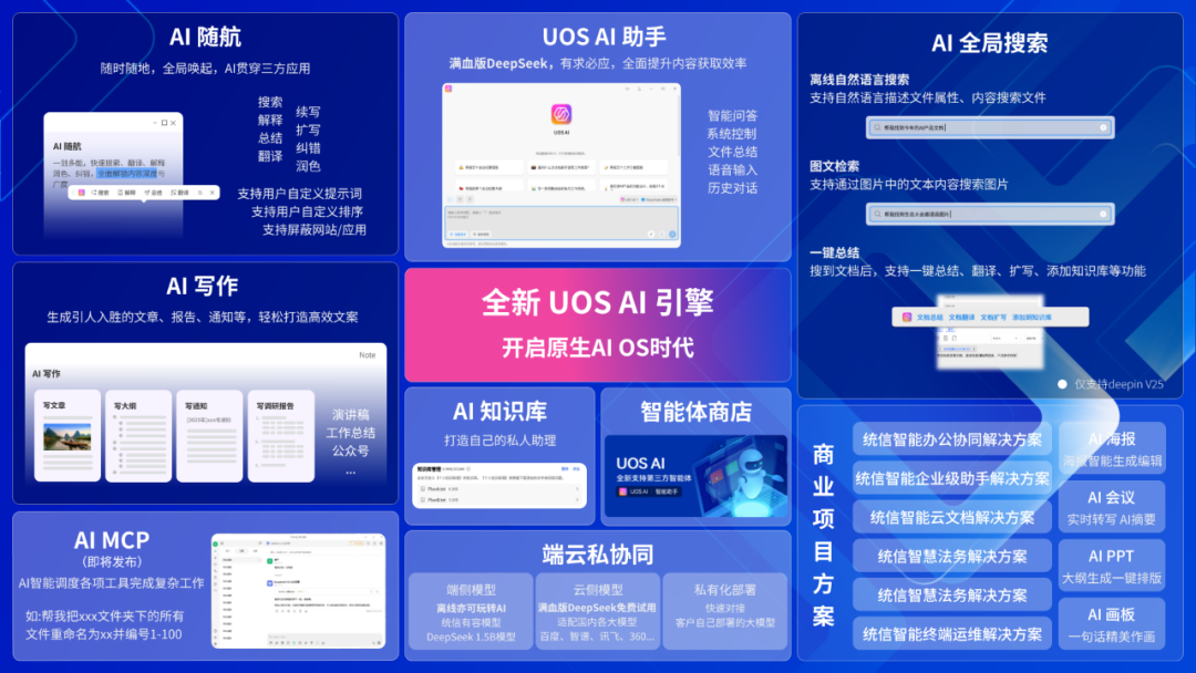 系统级AI:将 AI 能力融入 OS 底层,让用户在使用统信 UOS 可随时随地、在任何应用中快速调用 AI 能力;