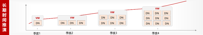 随着公司业务的蓬勃发展,为了满足公司业务的扩张,数据库扩容是业界通用的解决方案。业务负载在长时间维度上推演,定量扩容是一个很好的解决方案(如图1所示),能够支撑更多的业务并发。