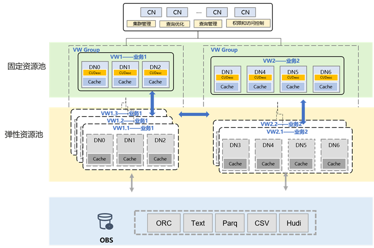 弹性资源池:适用于细粒度时间范围的负载波动场景,存在一个或多个弹性VW。弹性VW在存储上实现了以OBS为基础储存的shared storage架构,而在计算上则是shared nothing架构。这就决定了计算和存储充分解耦,计算和存储可以实现分层扩展。计算节点扩容无需数据重分布,存储资源按需扩容,实现无限容量存储。弹性VW与主VW之间实时数据共享以解决元数据实时同步问题,避免元数据的滞后刷新,使得弹性VW能够实时利用最新的元数据进行作业执行。本篇文章主要介绍DWS手动弹性VW方案。