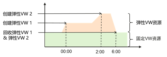 手动弹性,顾名思义,客户需要手动设置弹性资源的扩容和缩容。具体来说,在图5中,公司的数据中台团队在每天的凌晨12点到6点执行ETL,完成大数据量的离线导入,ETL负载存在两个阶跃式的增长。在手动弹性的帮助下,DWS在12点时会定时准备好弹性VW 1以消费第一阶段的负载增长,而在凌晨4点又由于负载再次增加,仍会定时准备弹性VW 2来满足第二阶段的负载突发。数据导入大约持续到6点,DWS会定时回收2个手动弹性VW。在此过程中,客户只需要额外为零点到6点这段时间额外付费,无需要对主VW进行资源超配,降低成本。