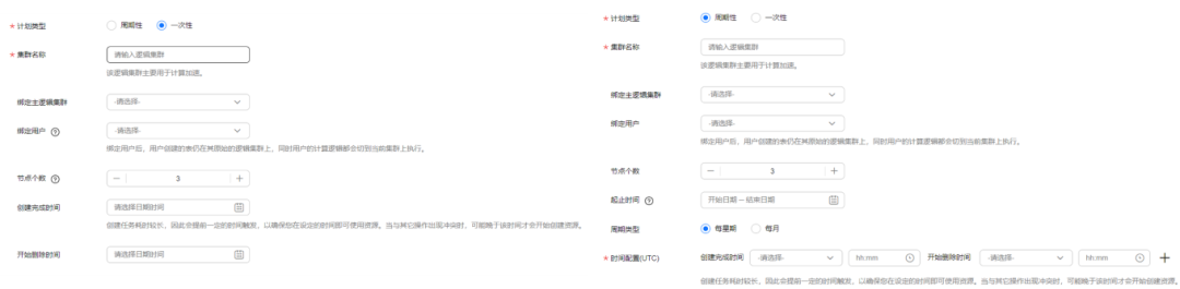 在集群列表中,单击集群名称,进入“集群详情”页面,点击“添加增删计划”并设置合理的弹性计划。如图6所示,我们需要设置计划类型和集群名称。我们提供一次性增删计划和周期性增删计划两种方式,其中一次性增删计划,创建完成时间和开始删除时间不是必选项(如果未设置,则立刻创建,删除需要手动删除)。在周期性增删计划中,创建完成时间和删除时间必须设置,支持设置每周或者每月的弹性计划,也支持多个时间段的弹性计划。设置完成后,DWS管理面会按照预期设置的时间进行弹性VW的创建和删除。