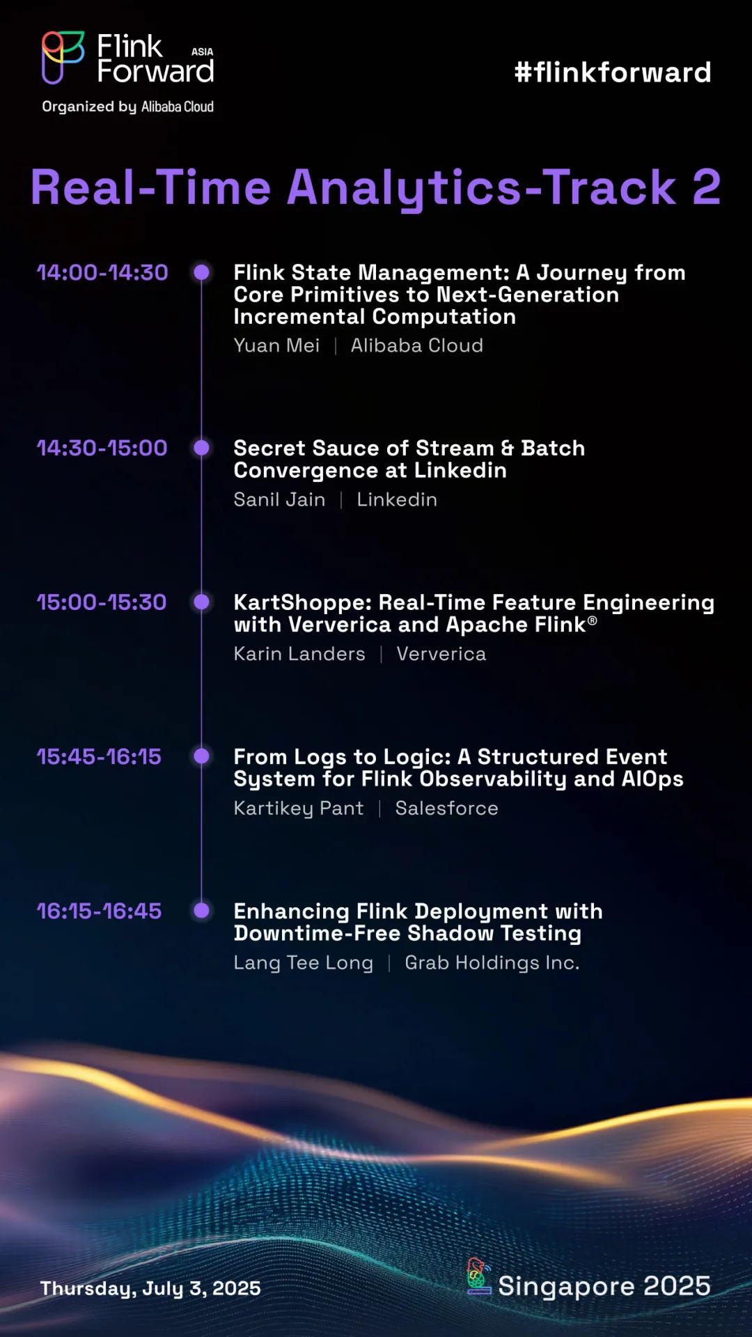 大会将汇聚来自全球顶尖企业的精彩见解,包括阿里云、Forrester、GoTo、Confluent、AWS、Synx Data Labs、Shopee、TikTok、Celerdata、VeloDB、Lalamove、Grab、LinkedIn、Ververica、Lazada Group、StarRocks、OceanBase 和 Salesforce 等。在这里将与大家深入探讨 Apache Flink 的核心技术、生态系统及应用场景,建立与志同道合的专业人士的联系,分享宝贵经验,共探技术成就。