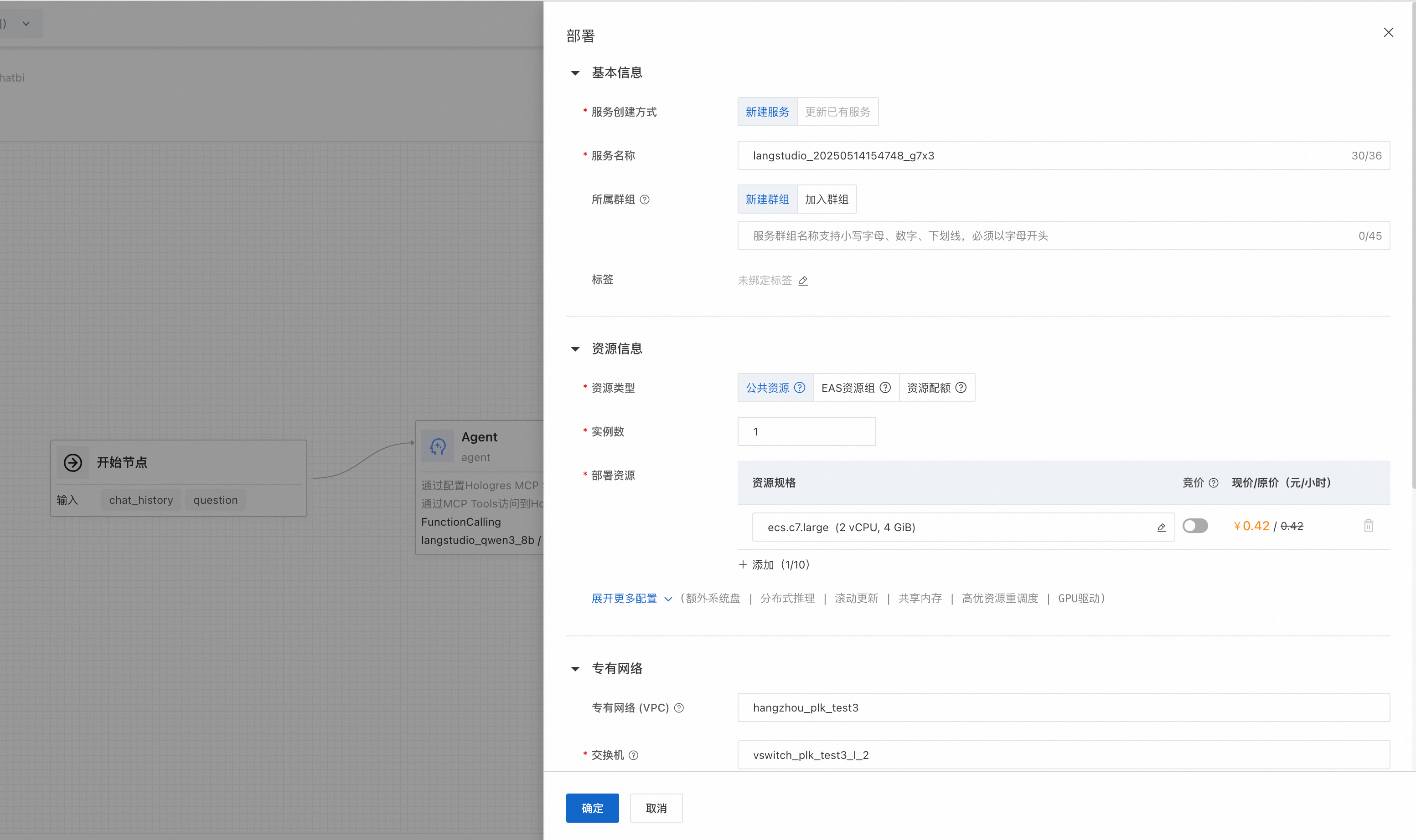 应用流开发调试完成后,单击右上角的部署,根据需要选择合适的机型以及专有网络,注意EAS实例需要使用与应用流中其他服务实例相同的VPC,以保证安全和网络连通。点击确定>跳转到PAI-EAS模型服务查看部署任务。