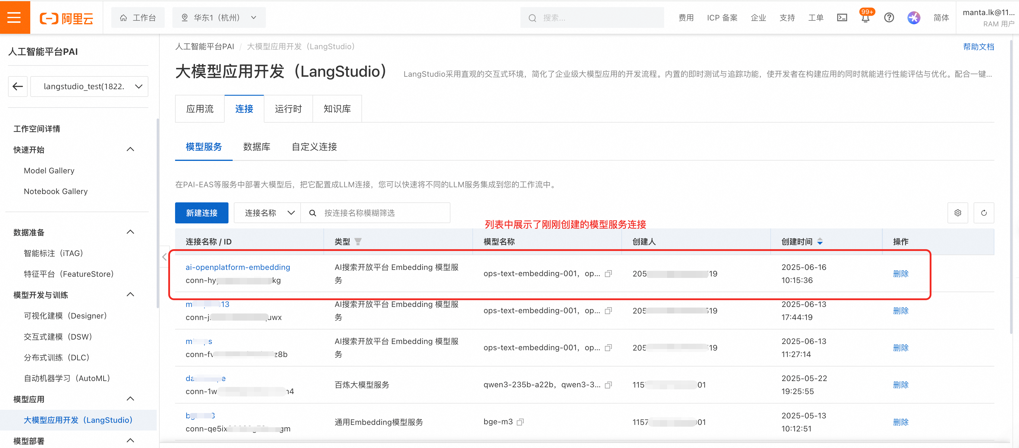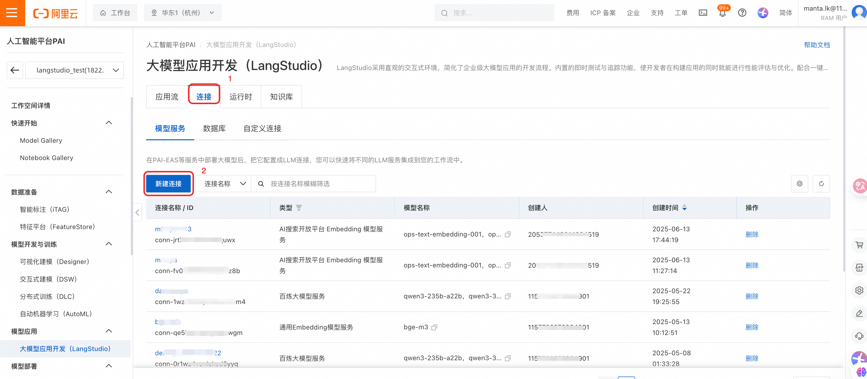通过 PAI控制台 > 进入PAI-LangStudio >连接 > 模型服务 >新建连接: