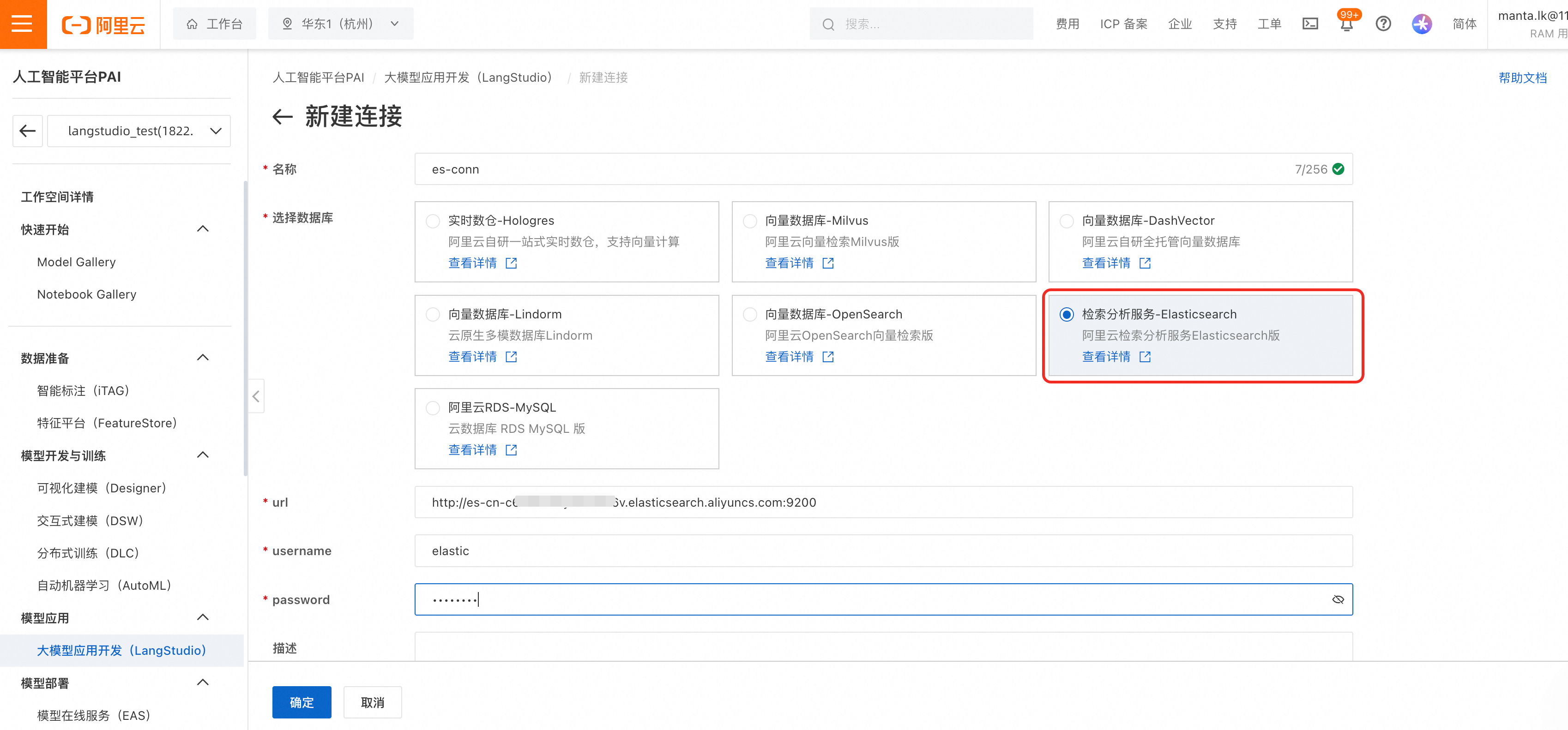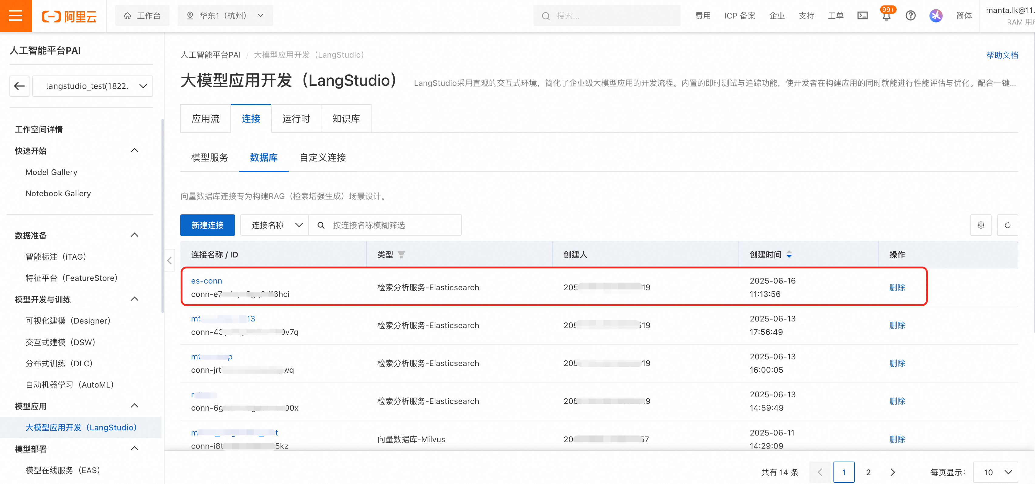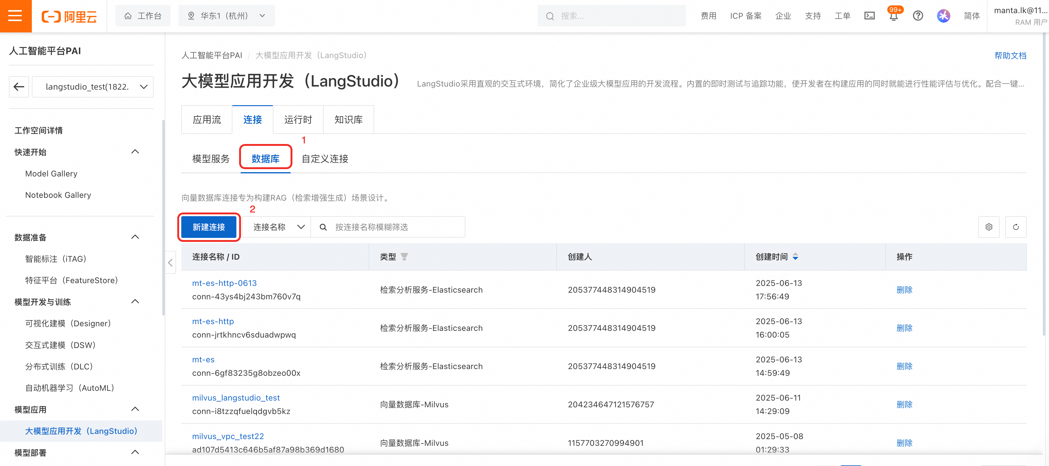 在PAI-LangStudio中,选择“连接” -> “数据库” 标签页后,点击“新建连接”: