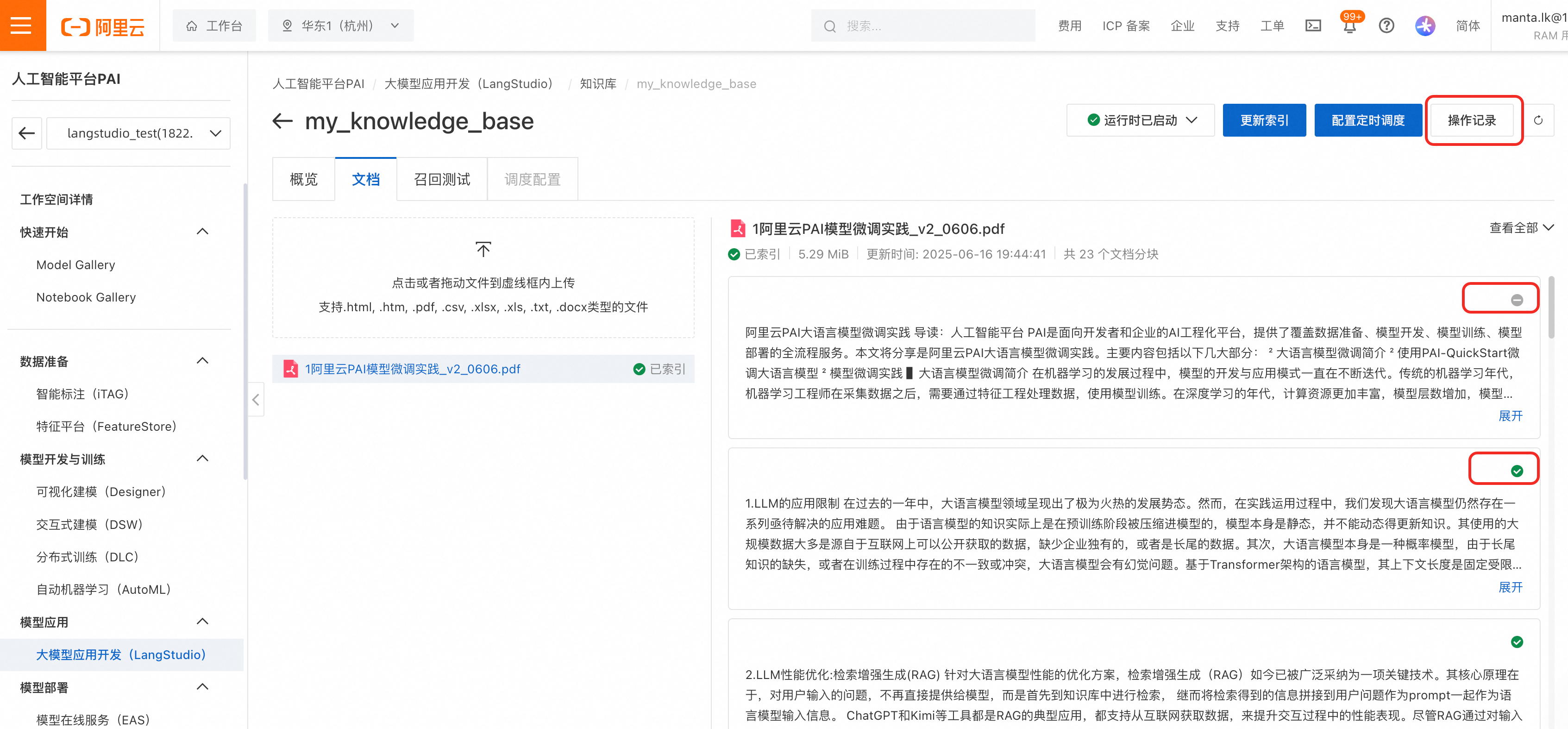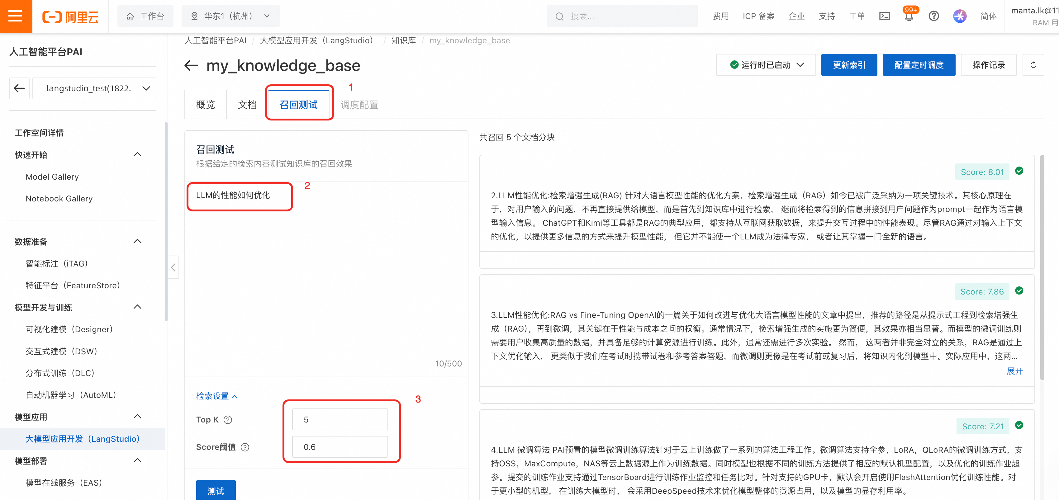 - 在PAI-LangStudio的新版知识库中,选择“召回测试”标签,输入问题,设置检索条件(建议score阈值在0.5-0.6之间)后,点击“测试”,可以在右侧看到召回结果: