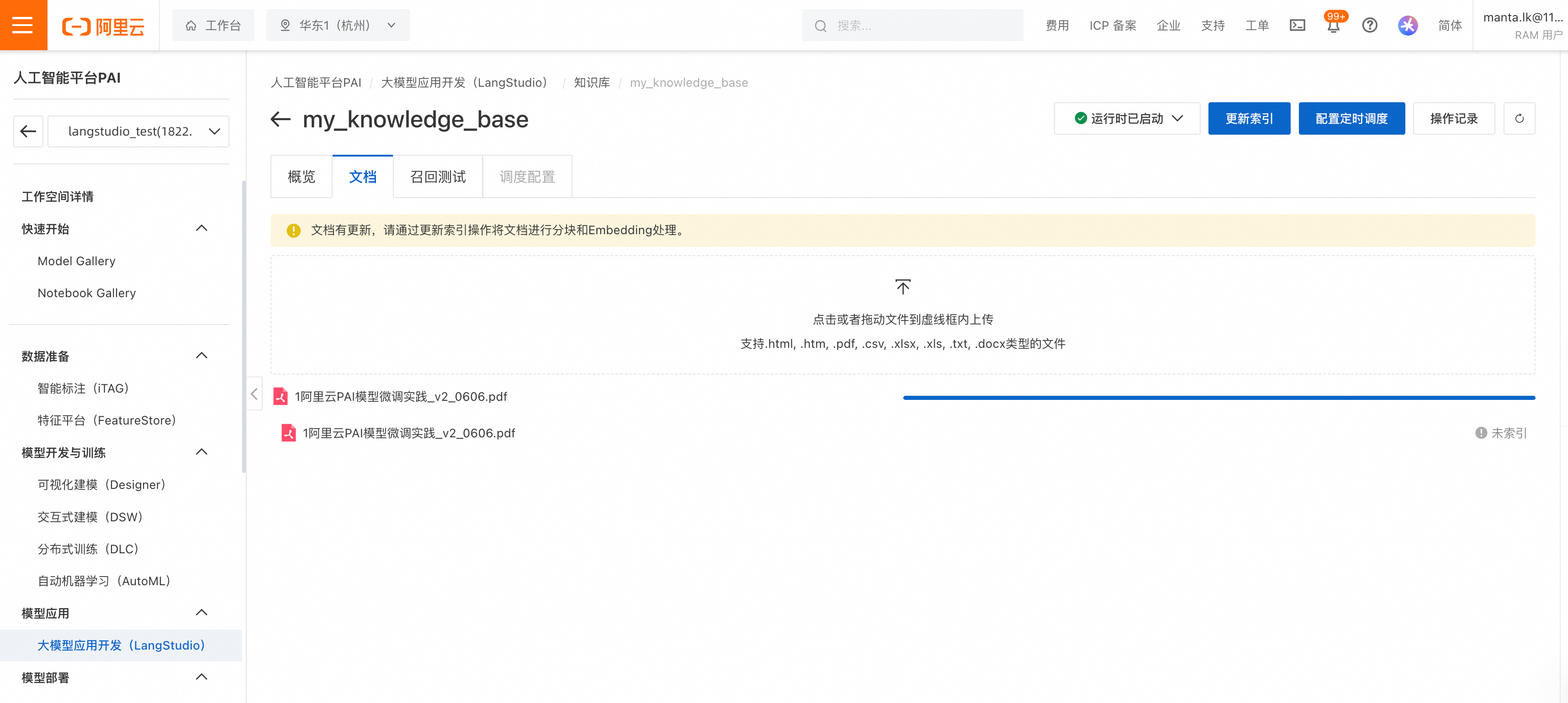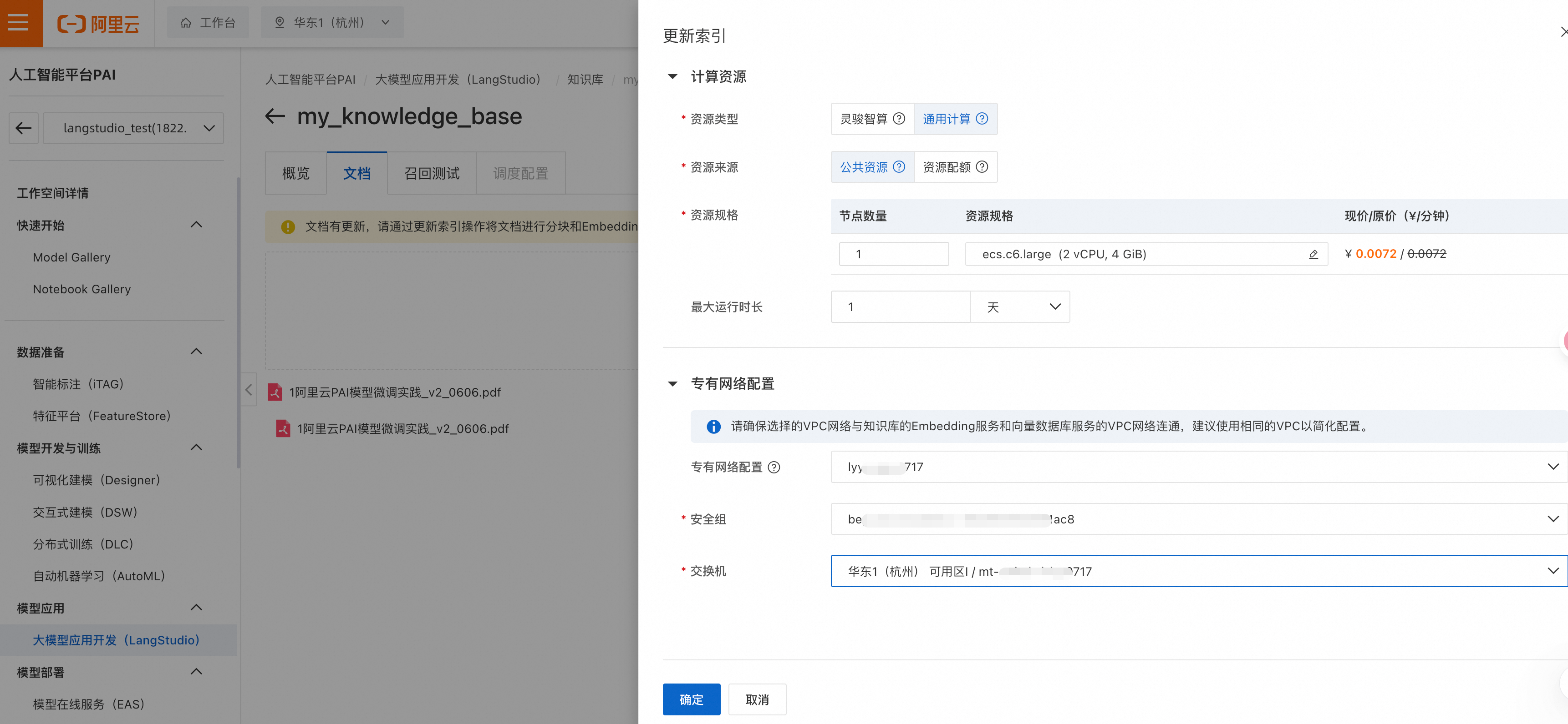 在文档上传后,点击“更新索引”按钮,在弹出的浮窗中选择网络和安全组资源配置后,点击“确定”,即可开始进行知识库索引的更新: