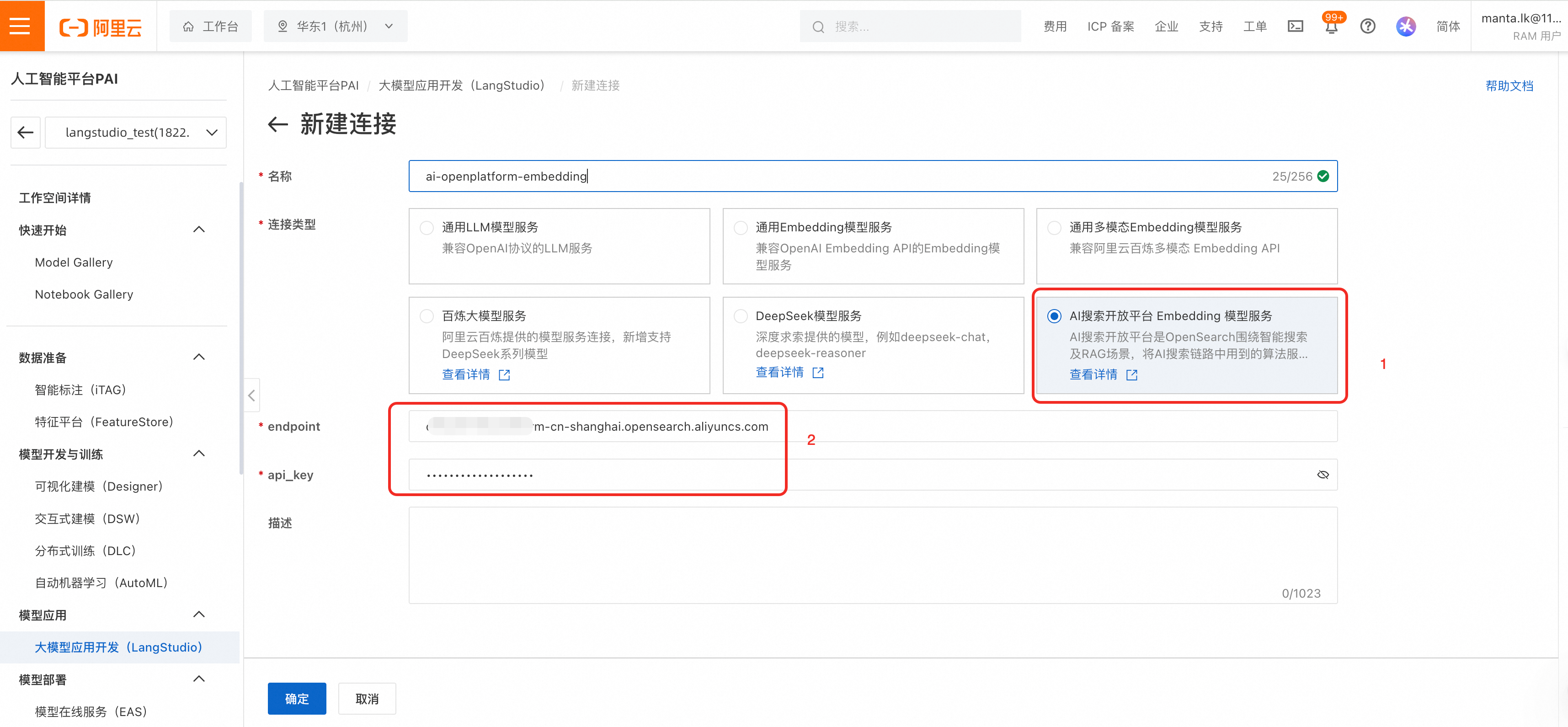 选择 “AI搜索开放平台 Embedding 模型服务”,并填入从AI搜索开放平台获取到的 Endpoint 和api_key,创建模型服务连接: