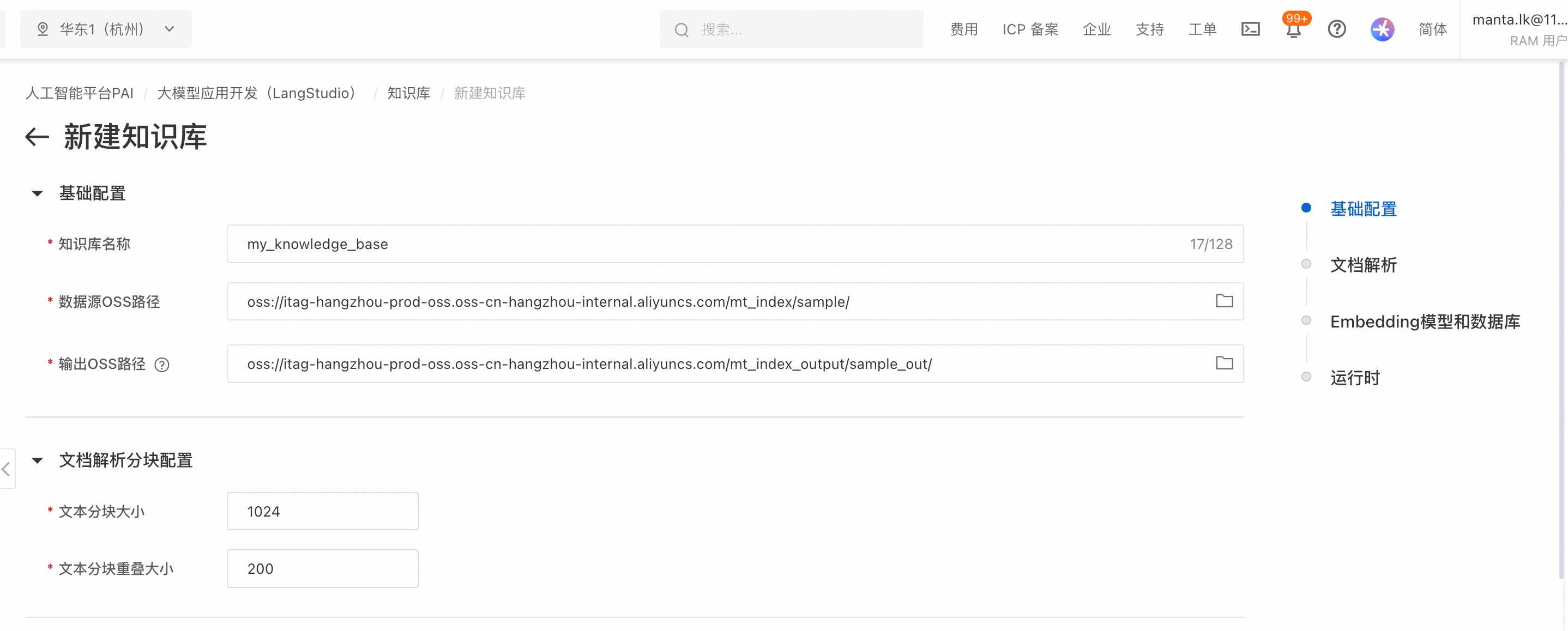 在PAI-LangStudio中,选择“知识库”标签页,并点击“新建知识库”,选择文档所在OSS路径作为“数据源OSS路径”,并选择一个“输出OSS路径”用来保存文档解析处理中间结果和索引相关信息:
