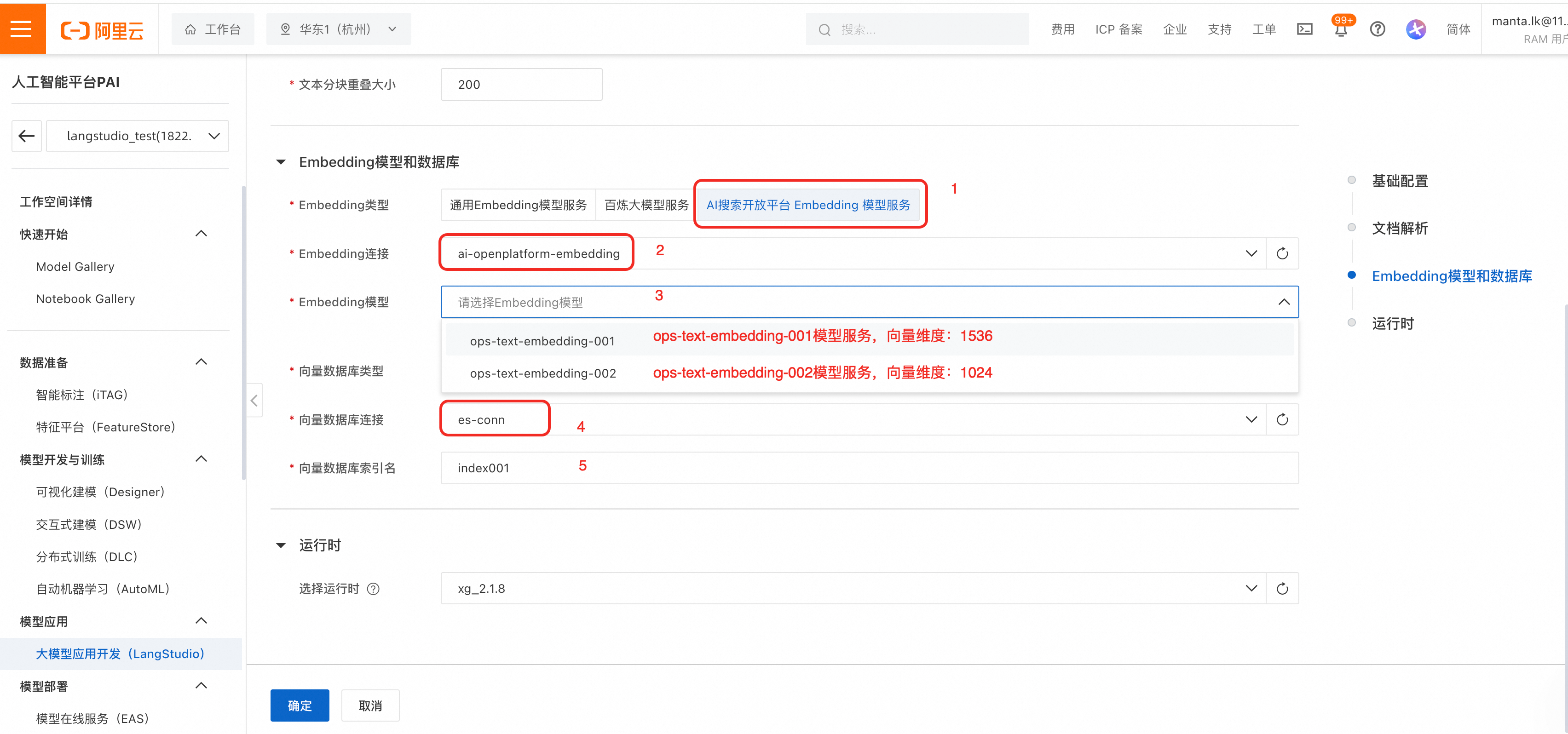 选择 “AI搜索开放平台 Embedding 模型服务”标签,并选择步骤一中创建的模型服务连接后,可以选择具体支持的Embedding模型(其中 001模型 和 002模型维度不同,可用于不同场景选择);选择步骤二中创建的向量数据库连接,并填入一个向量数据库索引名,选择步骤5中创建的运行时后,点击确定: