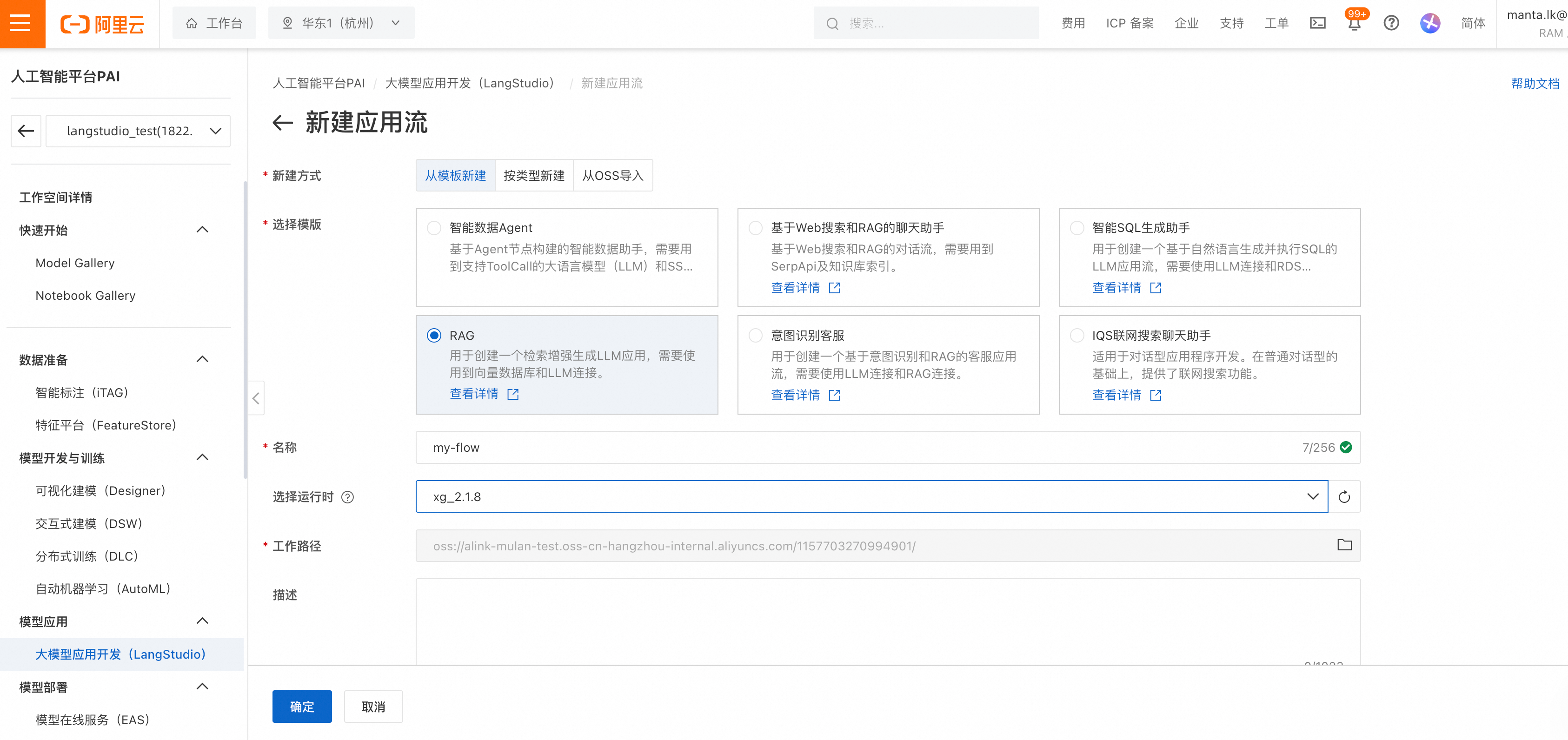 - 在PAI-LangStudio的“应用流”标签点击“新建应用流”,选择“从模板新建” -> “RAG”模板,创建应用流:
