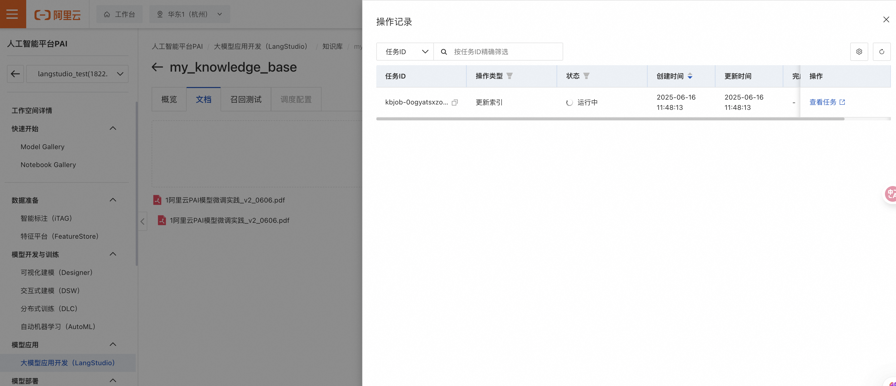 此时可以看到有一个索引创建的任务在运行中(也可以通过知识库->操作记录查看任务):