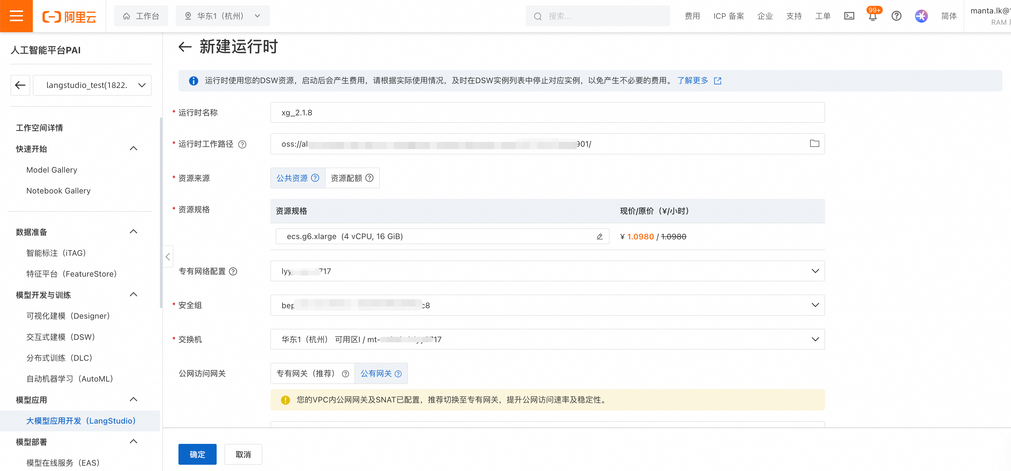 "运行时"设置确认。在PAI-LangStudio中选择“运行时”标签页,点击“新建运行时”,填入必要的信息如:运行时工作路径(选择OSSbucket中一个目录)、专有网络、安全组与交换机信息(需要跟Elasticsearch所在网络畅通)后点击“确定”: