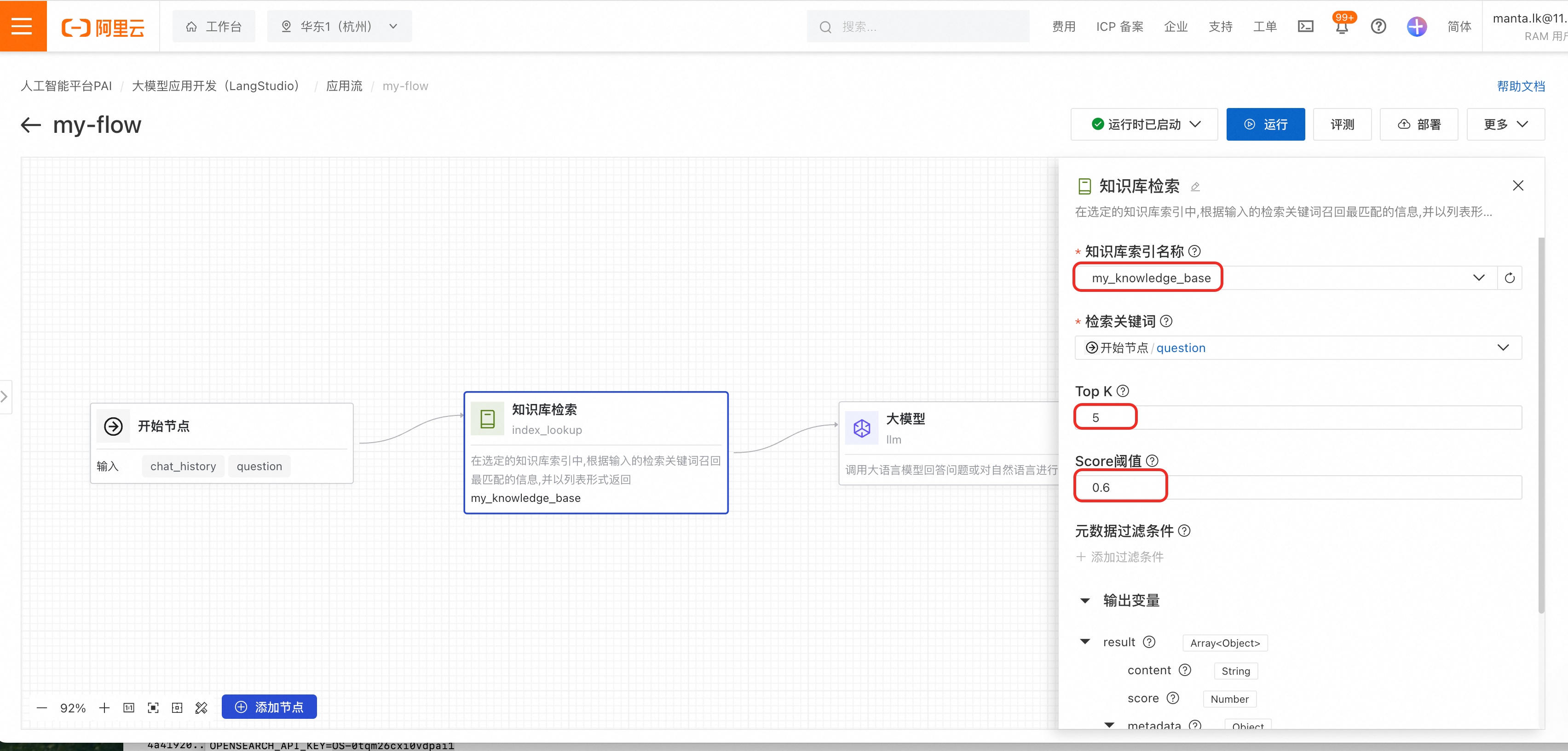 点击“知识库检索”节点,配置检索参数(选择知识库索引,设置filter):