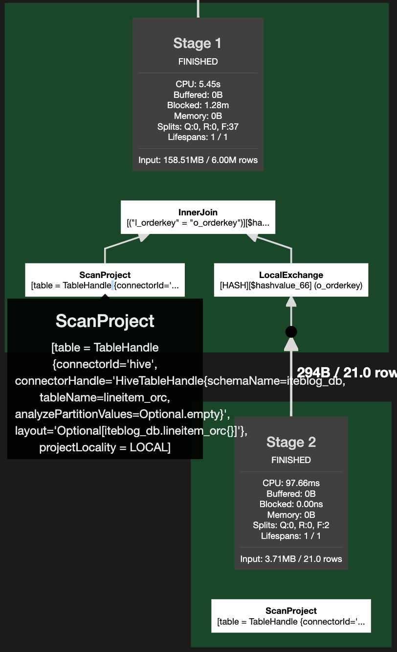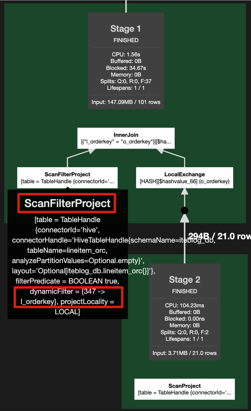 在扫描 lineitem_orc 表的时候,多了一个 dynamicFilter = {347 -> l_orderkey},这个就是 Presto 运行过程中自动加的过滤条件,相当于在查询 lineitem_orc 表的时候加了一个 l_orderkey in (select o_orderkey from orders_orc where o_custkey=66007)。